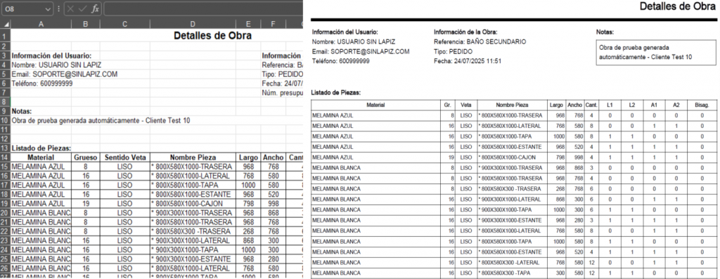 Exporta el despiece de una o varias obras simultáneamente a PDF y a Excel con todos los datos necesarios pera que tu proveedor de corte presupueste más rápidamente.